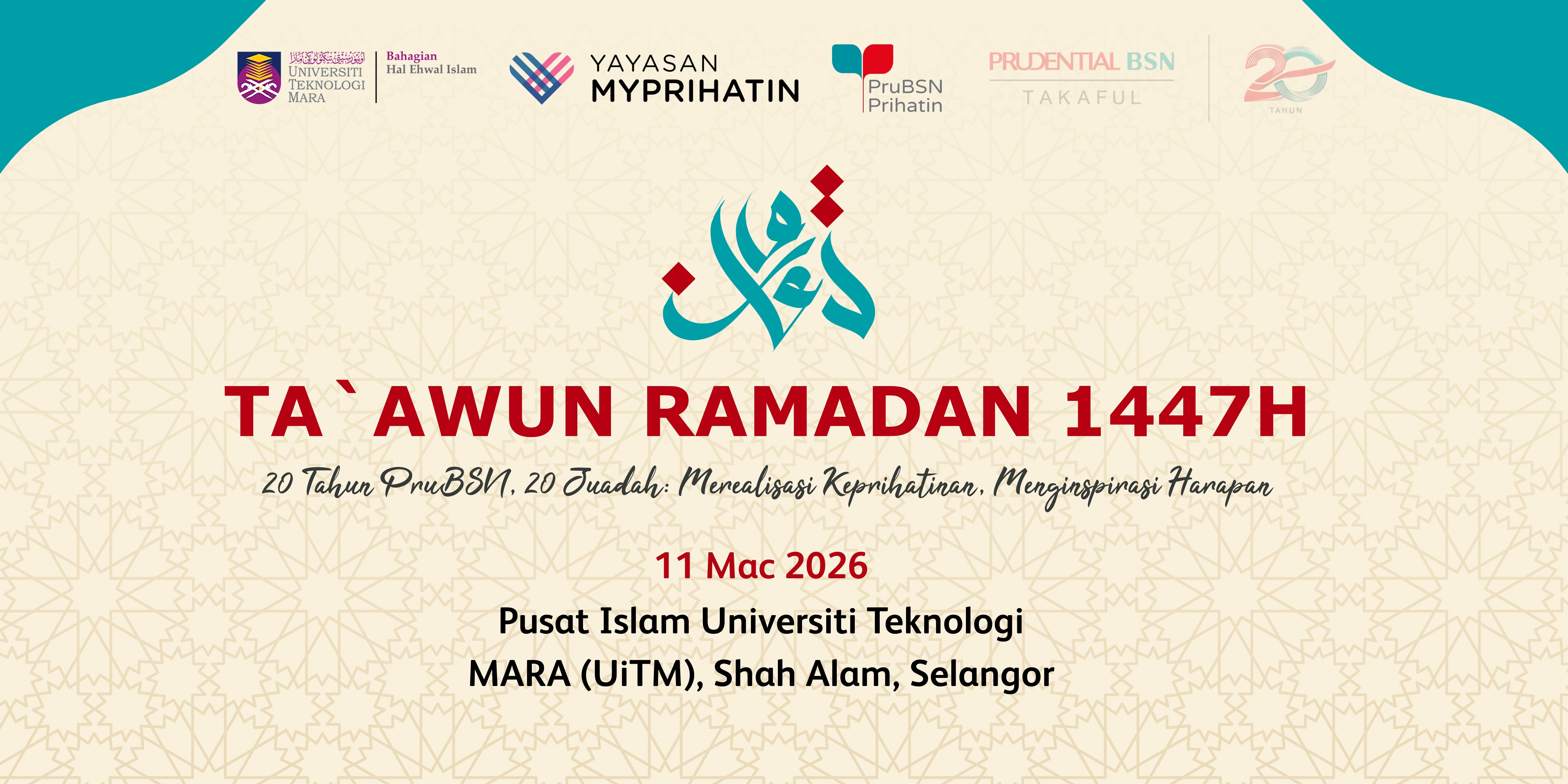 TA’AWUN RAMADAN 1447H 20 Tahun PruBSN, 20 Juadah: Merealisasi Keprihatinan. Menginspirasi Harapan 11 Mac 2026 Pusat Islam Universiti Teknologi MARA